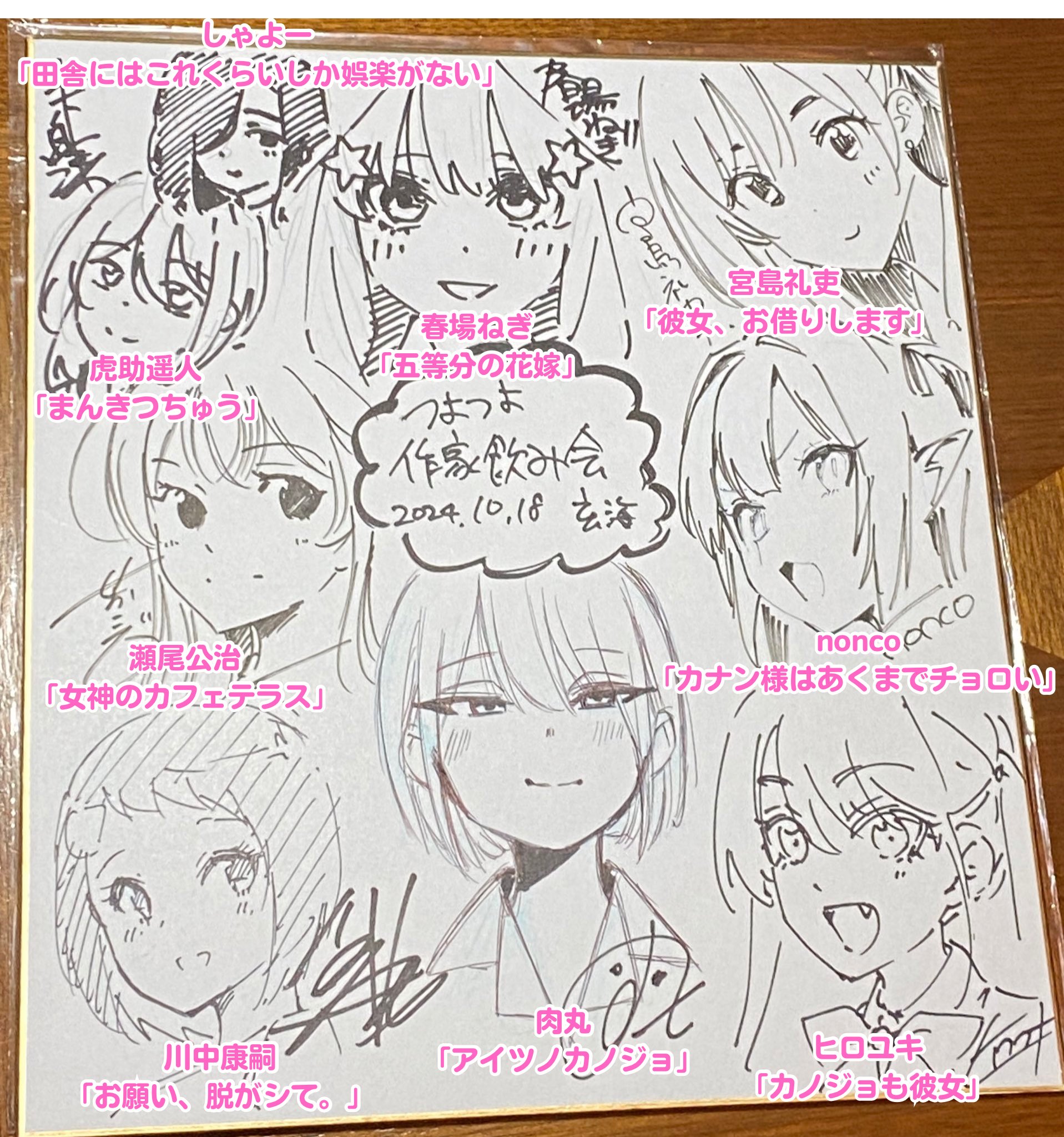 Xでは「今日はラブコメ作家の飲み会でした。楽しかったです」と報告。投稿した写真では、『五等分の花嫁』作者の春場ねぎ、『彼女、お借りします』の宮島礼吏らが寄せ書きした色紙を見ることができる。